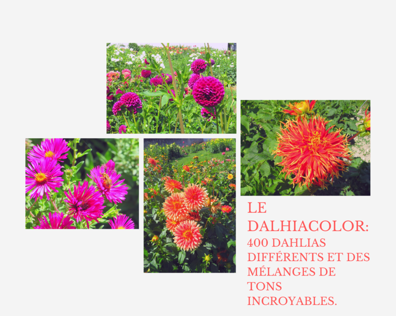 Le jardin contemporain est composé de parterres de dahlias de plusieurs variétés traités comme des taches de couleur, il permet de découvrir l’extraordinaire biodiversité de cette fleur éclatante et généreuse. Ce jardin regroupe aujourd’hui plus de 5 000 tubercules, avec 400 variétés différentes dans la forme et la couleur. C’est un régal pour les yeux. Lorsque j’ai visité les jardins, il faisait très chaud et les légumes étaient quelque peu fripés, les Dahlias un peu défraichis et le ciel d’un bleu incroyable.